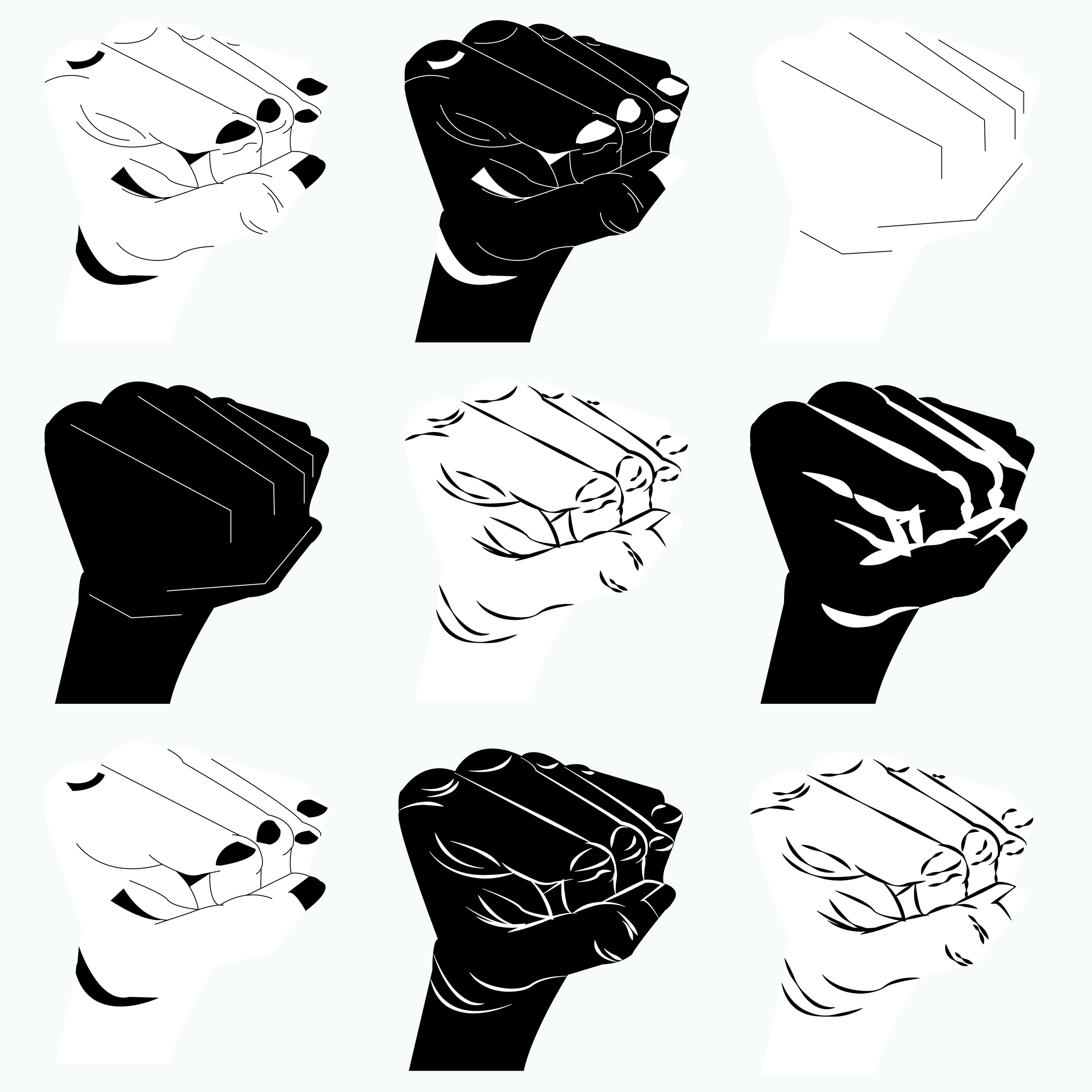 We began by randomly drawing prompts from a hat—one for a random hand gesture and one for a descriptive word. I pulled "fist" and "kneel," two words that immediately felt powerful and political. For the next in-person class, we were asked to bring in a random object from home and since it was near Halloween, I brought in a plastic skull. From there, we explored how to visually combine the hand gesture, the object, and the word using only black and white, simple lines, and clean shapes.